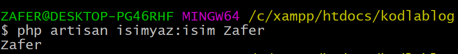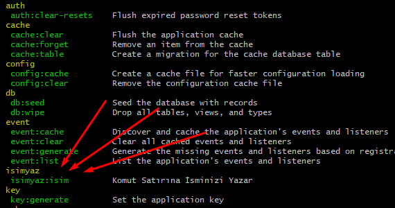 $signature ve $dexription alanları önemlidir. Signature alanında komutu oluşturup description alanında ise anlamını yazarız. Böylelikle php artisan list yazdığımız zaman ekranda komutun ne işe yaradığını anlatan kısmı görmüş oluruz. Hemen deneyelim.