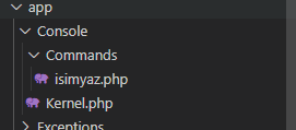 Yeni bir komut oluşturmak için make:command komutunu kullanabiliriz. Bu komut, app/Console/Commands dizininde yeni bir komut sınıfı oluşturacaktır. Uygulamanızı ilk oluşturduğunuzda böyle bir klasör yoktur. Komutu kullandığımız zaman artisan bizim için oluşuturur.